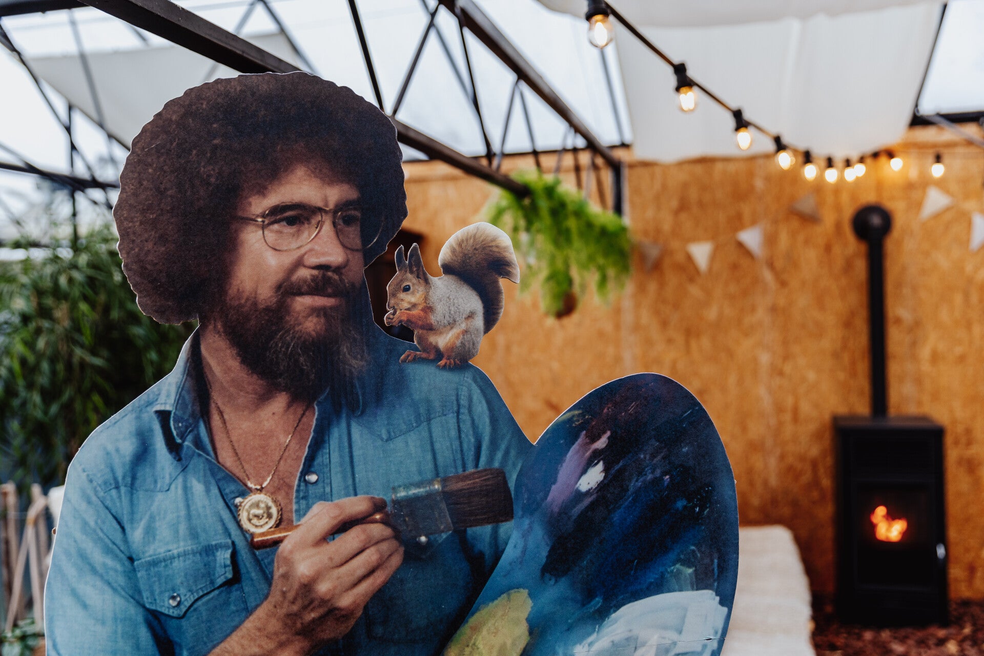 Jaja, we gaan painten! Blijkbaar stond dit al heel lang op Wendy's wishlist en toen was Ilse daar ineens van Masterpiece Moments by Ilse, gecertificeerd Bob Ross-instructeur (CRI). En die vond ons (of nou vooral Ted) als Bob Ross lookalikes de perfecte combinatie voor een Bob Ross workshop. En laat Wendy vroeger nou groot fan geweest zijn van die man, z'n grote bos haar, de masterpiece landschappen die hij in een mum van tijd op z'n doek toverde én mistakes die omgedoopt werden tot happy little accidents! Wij hebben geen idee maar gaan dan weer goed op enthousiasme en die is rijkelijk aanwezig bij zowel Wendy als Ilse! Wat je ook van Bob's schilderijen vindt, zijn haast meditatieve filmpjes heeft velen aan de buis gekluisterd gehouden, Wendy dus ook in haar jonge jaren.